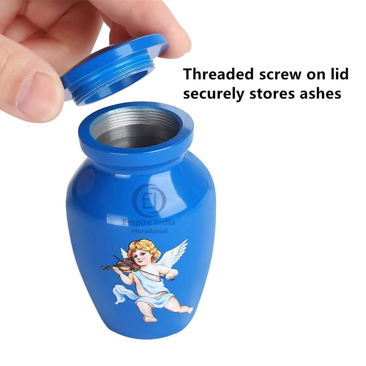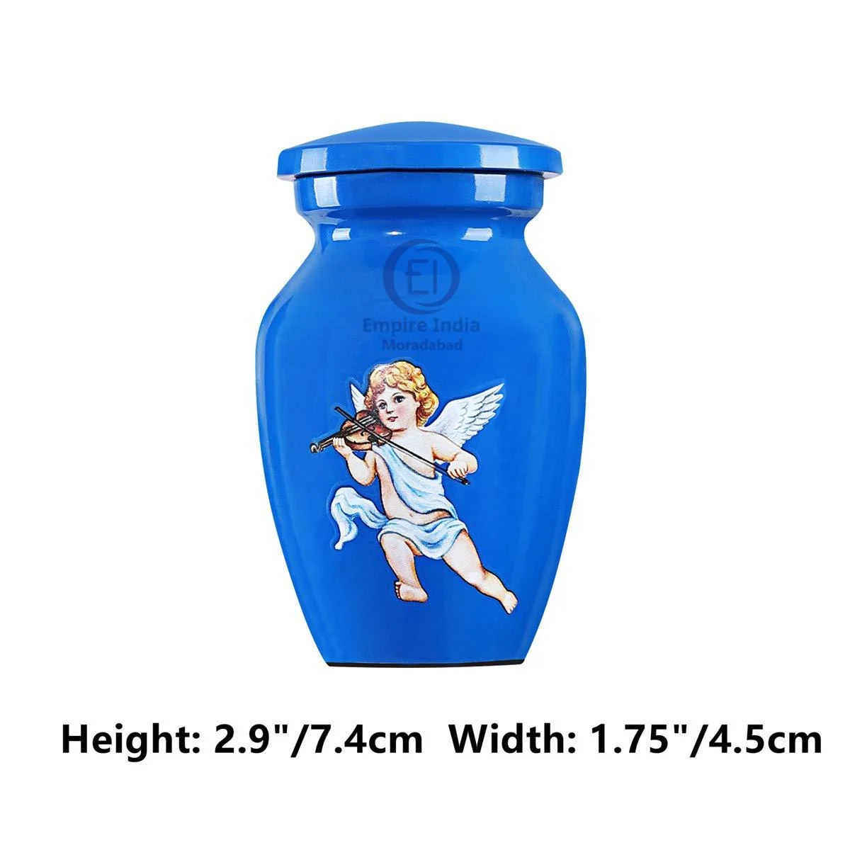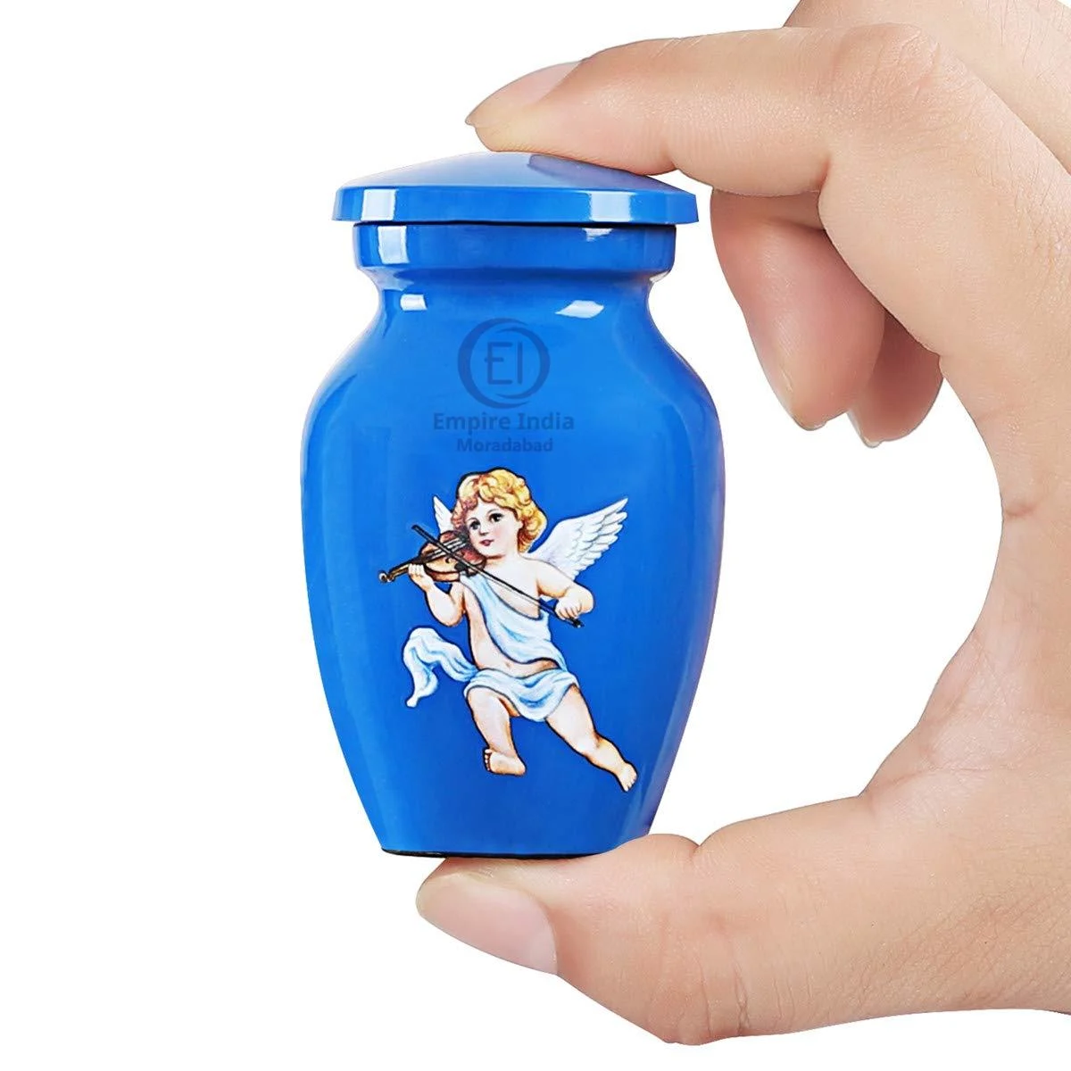 blue cremation urn, angel keepsake urn, cherub urn, urn with violin angel design, painted aluminum urn, mini urn for ashes, child remembrance urn, memorial keepsake, urn manufacturer india, urn supplier moradabad, empire india urns, painted baby urn, indian cremation urn exporter,