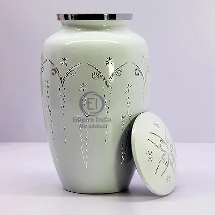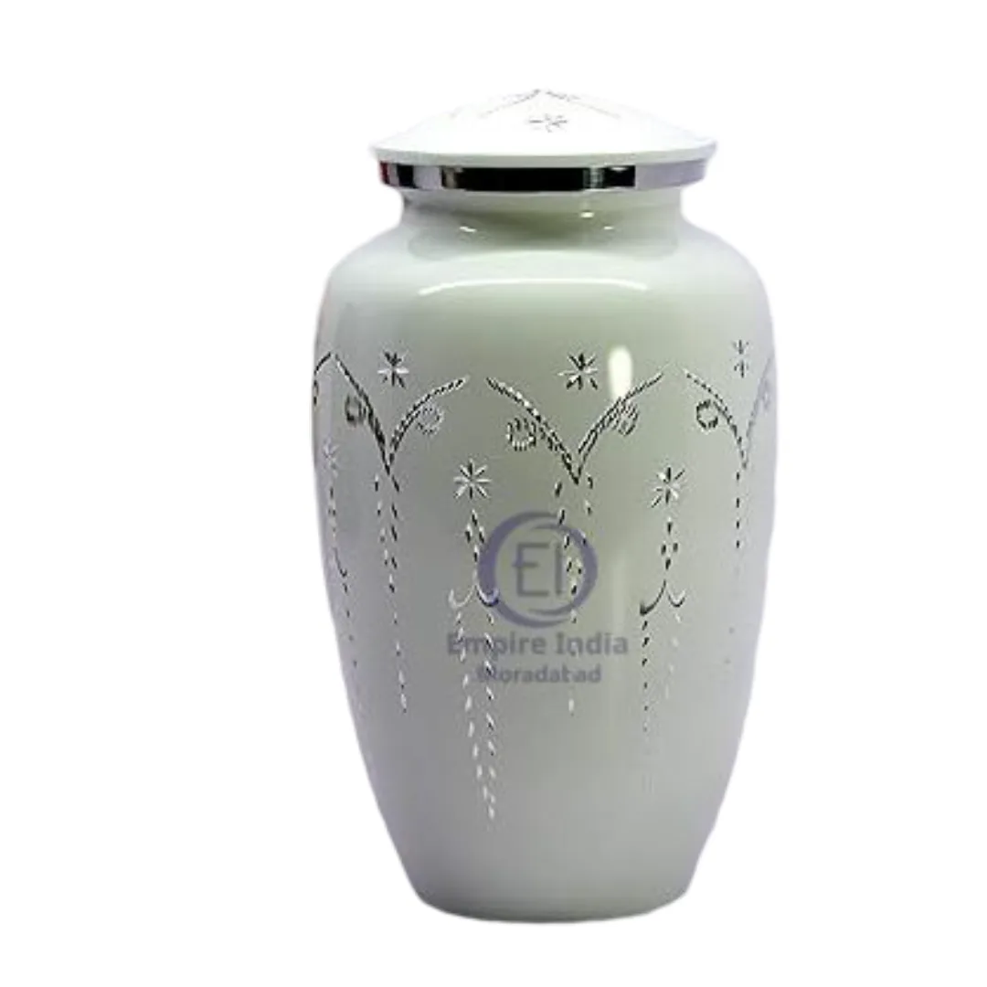 white cremation urn for adults, aluminum funeral urn with floral engraving, meena coated white urn, handcrafted urn from Moradabad, Empire India metal urns, elegant memorial urn, flower engraved ashes container, white enamel urn for human ashes, metal urn for adult cremation, keepsake urn with meena finish