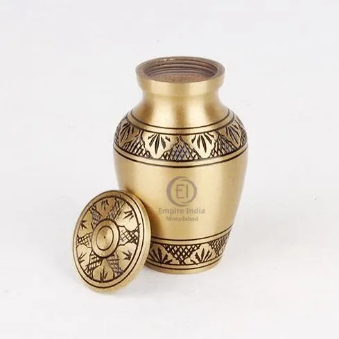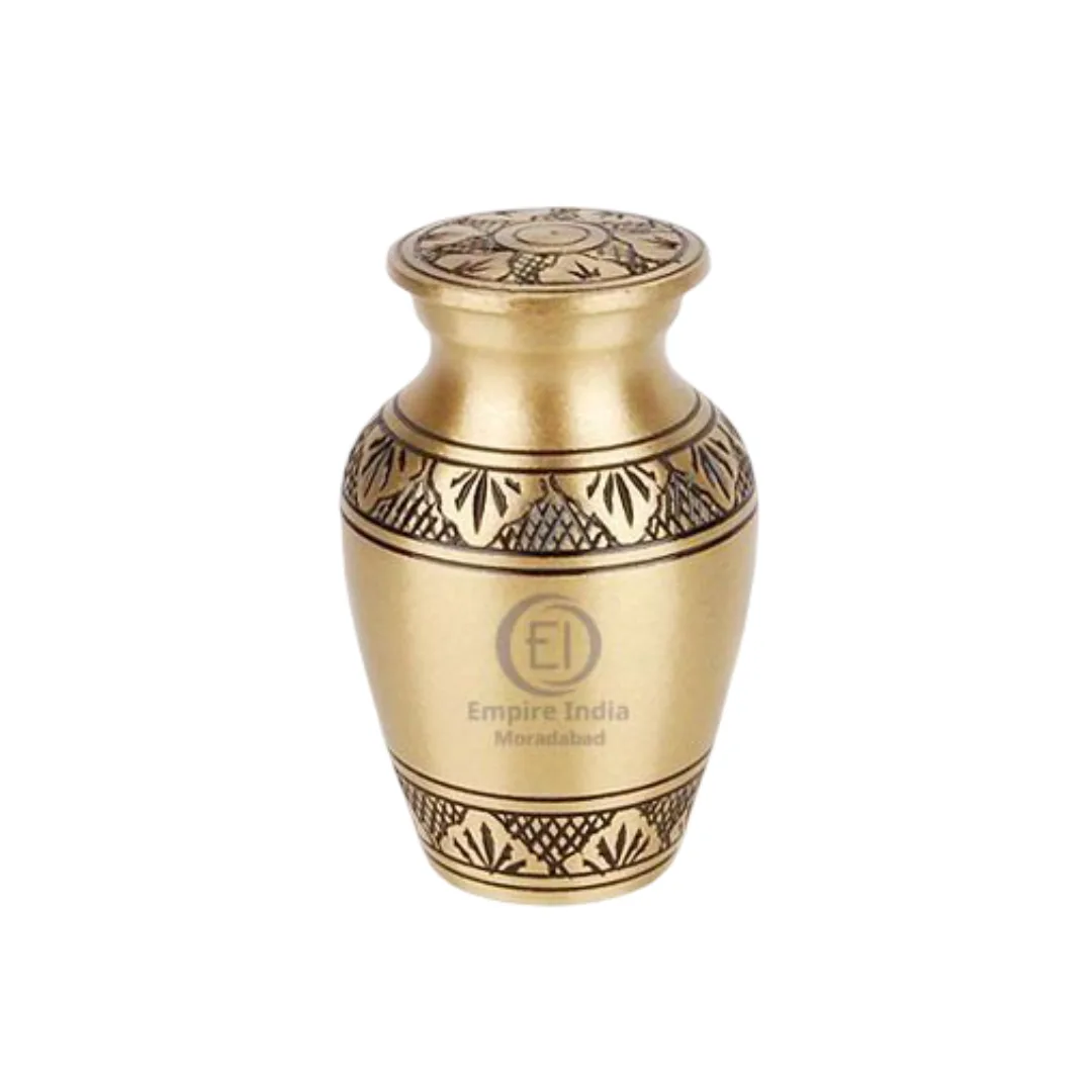gold keepsake urn, brass cremation urn, engraved mini urn, small brass urn for ashes, decorative keepsake urn, memorial urn, funeral urns India, handmade brass urn, Empire India, Empire India Moradabad, Moradabad urn manufacturer, cremation urn supplier, mini ashes container, traditional engraved urn
