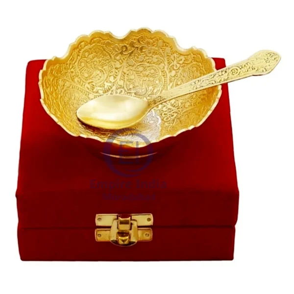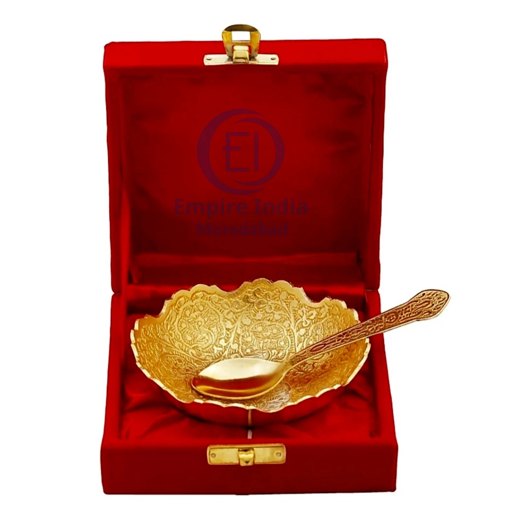 gold-plated engraved bowl, return gift velvet box bowl, festive gift item, wedding dry fruit serving bowl, floral emboss bowl with spoon, Empire India, Empire India Moradabad