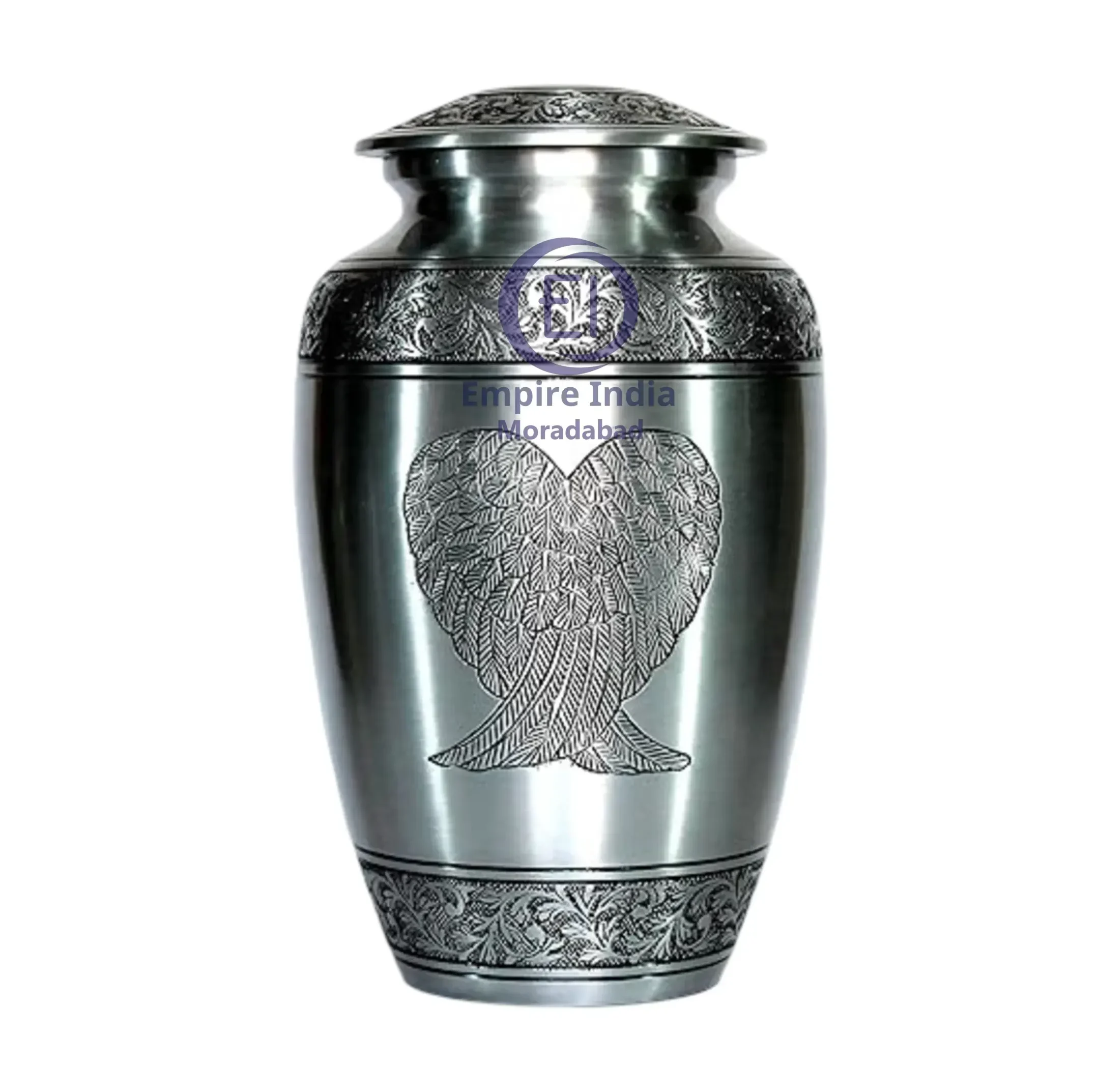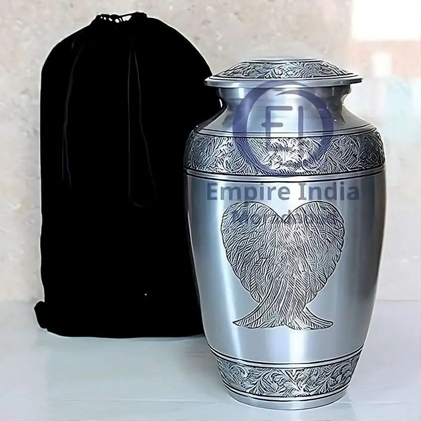 Angel Wings Cremation Urn , Silver Aluminum Urn for Human Ashes, Nickel Finish Memorial Urn, Handmade Urns from Moradabad, Empire India Urns, Engraved Funeral Urn, Sympathy Ashes Container, Adult Size Cremation Urn, Elegant Keepsake Urn, Metal Handicraft Memorial Urn