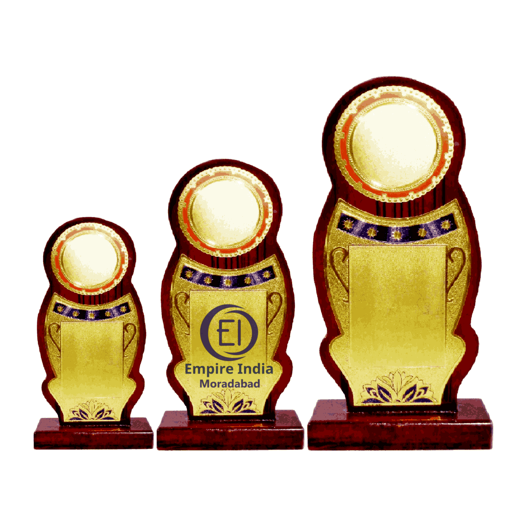 Oval top wooden trophy set, Custom engraved MDF plaque, Gold foil and blue star trophy, Empire India award mementos, Wooden awards for sports and events, Floral base trophy design, Bulk MDF trophy supplier, Personalized wooden award, Star studded plaque for schools, Corporate trophy manufacturer in Moradabad