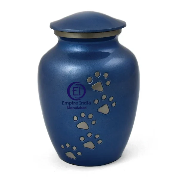 blue painted pet urn, pet cremation urn with paw prints, aluminum urn for pet ashes, Empire India pet urns, Moradabad urn manufacturer, pet memorial container India, silver paw print urn, painted finish cremation urn, pet urn exporter India, dog cat ashes urn blue,