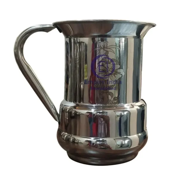 Wide-mouth stainless steel jug, heavy base water jug, EmpireIndia, EmpireIndiaMoradabad, Moradabad metalware manufacturer, Indian stainless steel serveware, floral engraving steel jug, hotel-grade water pitcher India, traditional kitchen jug exporter, durable Indian steel utensils,